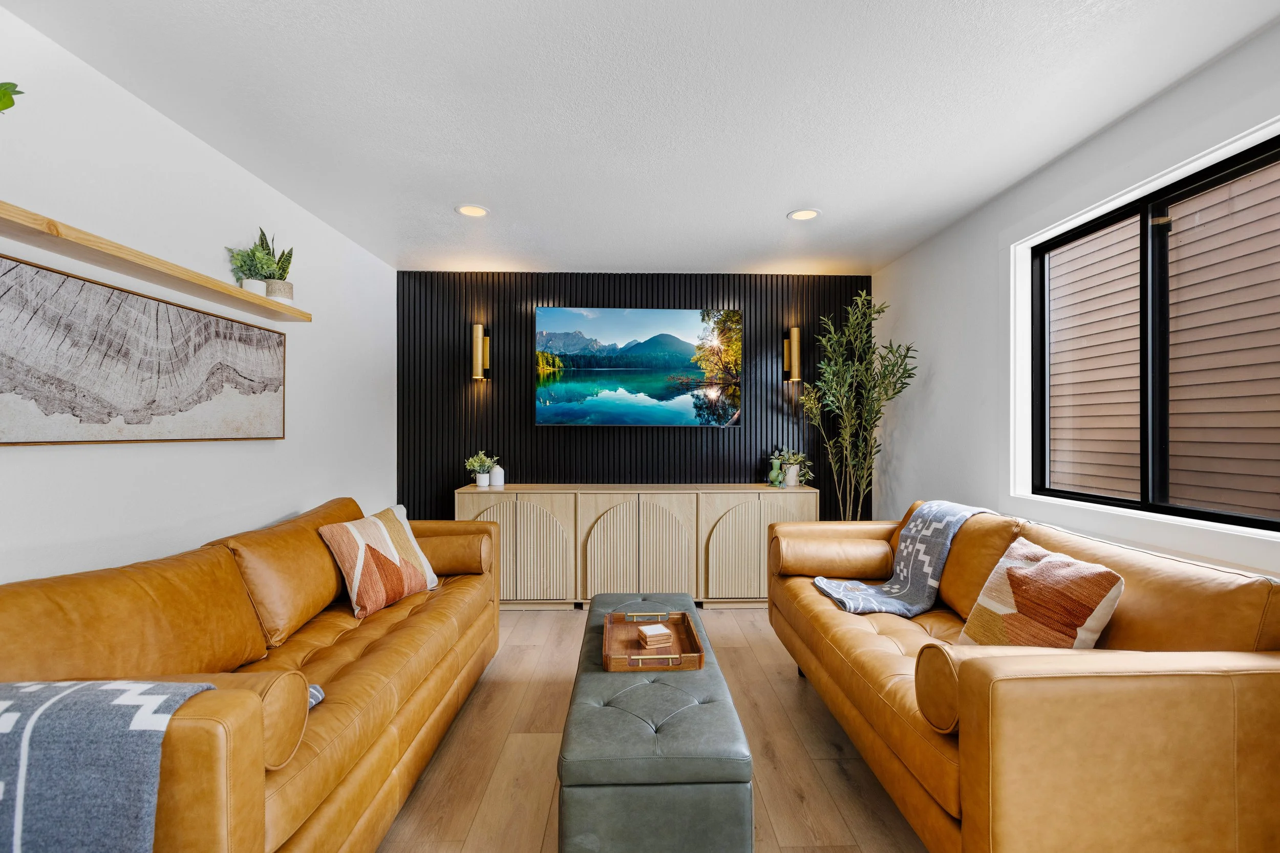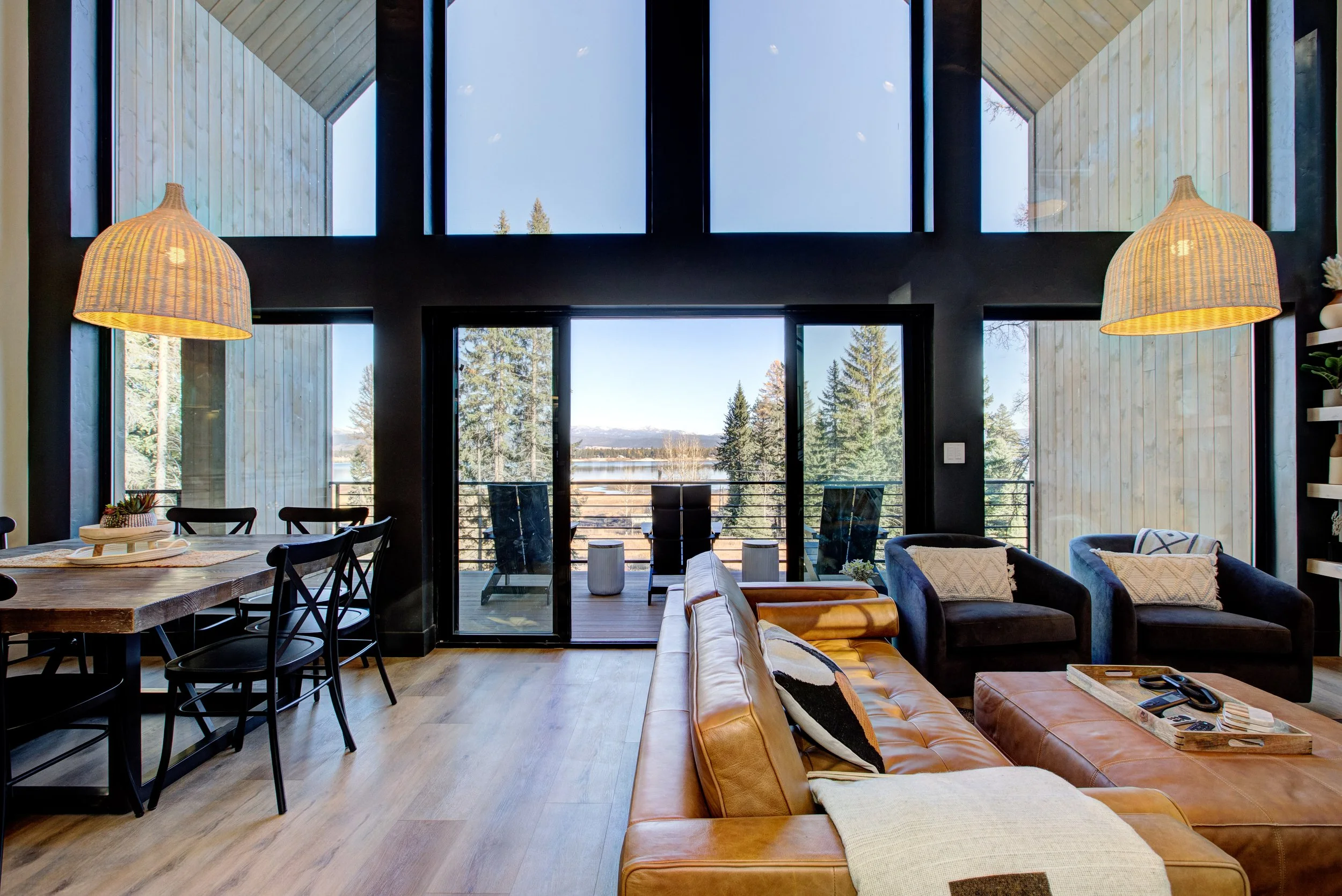 The living space is thoughtfully curated with premium Poly & Bark leather sofas, ottomans, dining chairs, and accent seating — blending contemporary luxury with relaxed mountain comfort.
